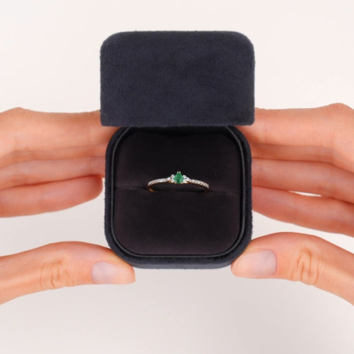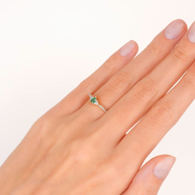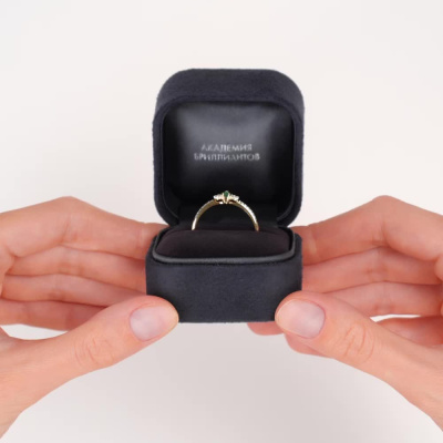 Кольцо с 6 бриллиантами природными, 0.04 карат, огранка круг 17 граней, цвет 2, чистота 2, тип огранки А; 14 бриллиантами природными, 0.04 карат, огранка круг 17 граней, цвет 2, чистота 2, тип огранки А; 1 изумрудом природным, 0.12 карат, цвет 3, чистота 3, тип огранки Б; Желтое золото 585 пробы.