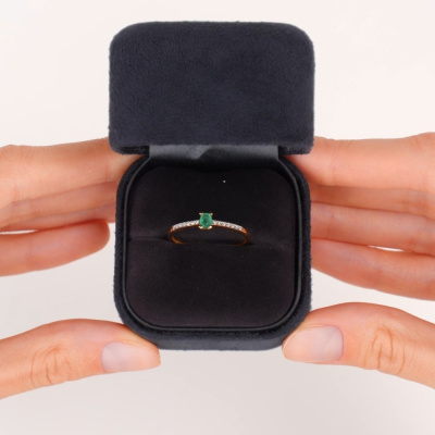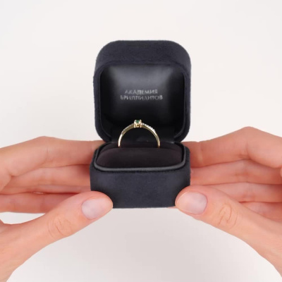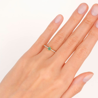 Кольцо с 14 бриллиантами природными, 0.04 карат, огранка круг 17 граней, цвет 2, чистота 2, тип огранки А; 1 изумрудом природным, 0.14 карат, цвет 3, чистота 3, тип огранки Б; Желтое золото 585 пробы.