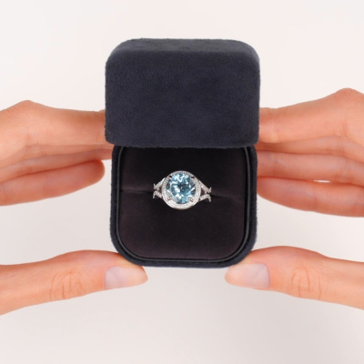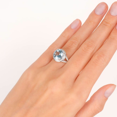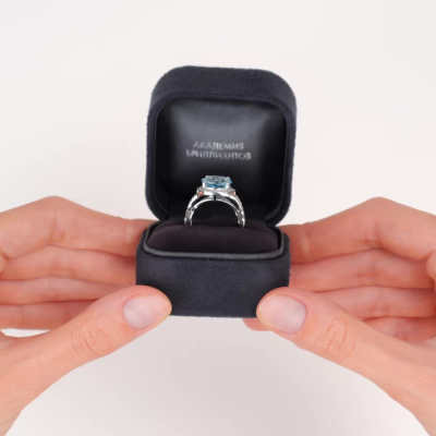 Кольцо с 8 бриллиантами природными, 0.08 карат, огранка круг 57 граней, цвет 3, чистота 6, тип огранки А; 12 бриллиантами природными, 0.1 карат, огранка круг 57 граней, цвет 3, чистота 6, тип огранки А; 28 бриллиантами природными, 0.08 карат, огранка круг 17 граней, цвет 2, чистота 2, тип огранки Б; 1 топазом скай природным, 4.38 карат; Белое золото 585 пробы.