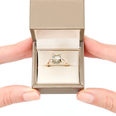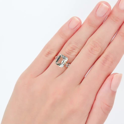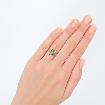 Кольцо с 1 празиолитом природным, 2.8 карат; 2 топазами бесцветными природными, 0.56 карат; Желтое золото 585 пробы.