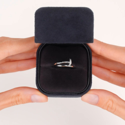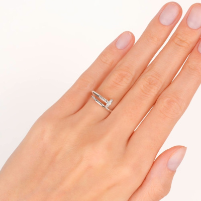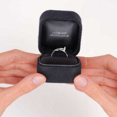 Кольцо с 11 бриллиантами природными, 0.03 карат, огранка круг 17 граней, цвет 2, чистота 2, тип огранки А; 2 бриллиантами природными, 0.005 карат, огранка круг 17 граней, цвет 2, чистота 2, тип огранки А; Белое золото 585 пробы.