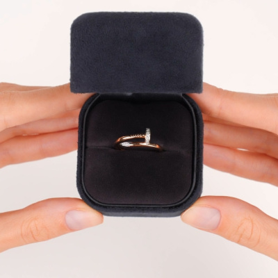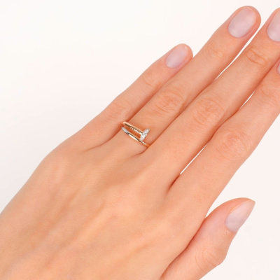 Кольцо с 11 бриллиантами природными, 0.03 карат, огранка круг 17 граней, цвет 2, чистота 2, тип огранки А; 2 бриллиантами природными, 0.005 карат, огранка круг 17 граней, цвет 2, чистота 2, тип огранки А; Розовое золото 585 пробы.