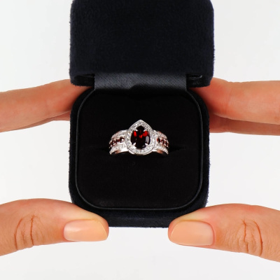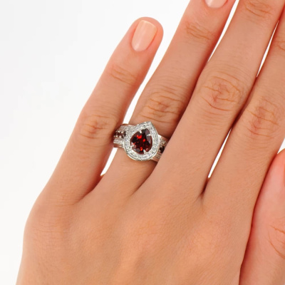 Кольцо с 50 бриллиантами природными, 0.35 карат, огранка круг 57 граней, цвет 3, чистота 6, тип огранки А; 1 гранатом природным, 1.18 карат; 10 гранатами природными, 0.46 карат; Белое золото 585 пробы.