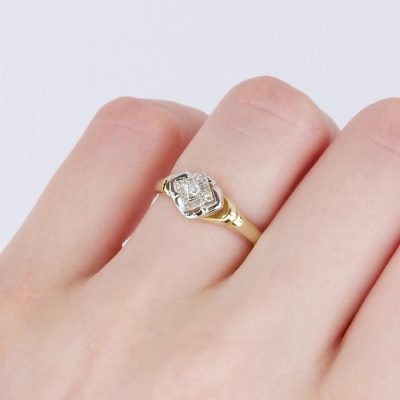 Кольцо с 1 бриллиантом природным, 0.01 карат, огранка круг 57 граней, цвет 3, чистота 6, тип огранки А; 16 бриллиантами природными, 0.02 карат, огранка круг 17 граней, цвет 2, чистота 2, тип огранки А; Желтое и белое золото 585 пробы.