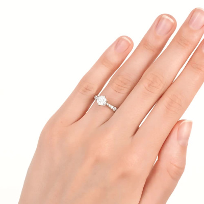 Кольцо с 1 бриллиантом природным, 0.11 карат, огранка круг 57 граней, цвет 3, чистота 6, тип огранки А; 2 бриллиантами природными, 0.07 карат, огранка круг 57 граней, цвет 3, чистота 6, тип огранки А; 2 бриллиантами природными, 0.05 карат, огранка круг 57 граней, цвет 3, чистота 6, тип огранки А; 8 бриллиантами природными, 0.12 карат, огранка круг 57 граней, цвет 3, чистота 6, тип огранки А; 2 бриллиантами природными, 0.03 карат, огранка круг 57 граней, цвет 3, чистота 6, тип огранки А; 2 бриллиантами природными, 0.01 карат, огранка круг 57 граней, цвет 3, чистота 6, тип огранки А; 2 бриллиантами природными, 0.007 карат, огранка круг 17 граней, цвет 2, чистота 2, тип огранки А; Белое золото 585 пробы.
