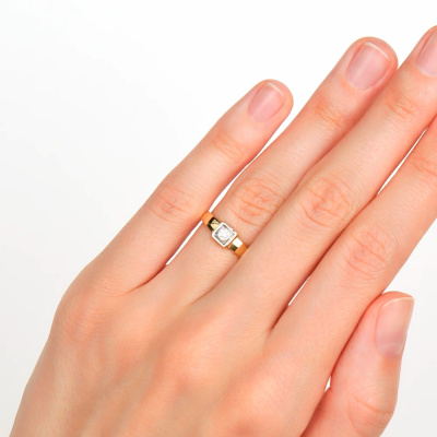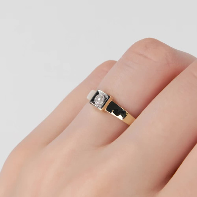 Кольцо с 1 бриллиантом природным, 0.007 карат, огранка круг 57 граней, цвет 3, чистота 6, тип огранки А; 6 бриллиантами природными, 0.01 карат, огранка круг 17 граней, цвет 2, чистота 2, тип огранки А; Желтое и белое золото 585 пробы.