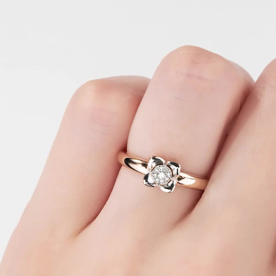 Кольцо с 1 бриллиантом природным, 0.01 карат, огранка круг 57 граней, цвет 3, чистота 6, тип огранки А; 8 бриллиантами природными, 0.01 карат, огранка круг 17 граней, цвет 2, чистота 2, тип огранки А; Розовое и белое золото 585 пробы.