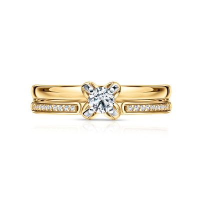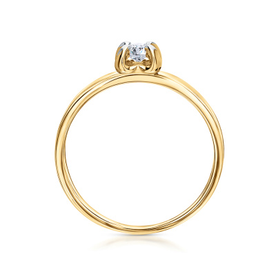 Кольцо с 1 бриллиантом природным, 0.16 карат, огранка круг 57 граней, цвет 3, чистота 6, тип огранки А; 22 бриллиантами природными, 0.05 карат, огранка круг 17 граней, цвет 2, чистота 2, тип огранки А; Желтое золото 585 пробы.