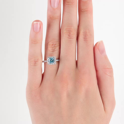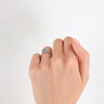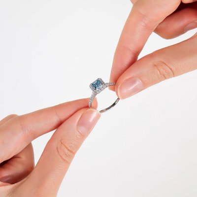 Кольцо с 1 бриллиантом выращенным, 0.79 карат, огранка принцесса 65 граней, цвет Голубой, чистота 5, тип огранки А; 34 бриллиантами выращенными, 0.36 карат, огранка круг 57 граней, цвет 3, чистота 5, тип огранки А; 14 бриллиантами выращенными, 0.11 карат, огранка круг 57 граней, цвет 3, чистота 6, тип огранки А; Белое золото 585 пробы.