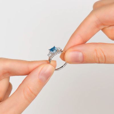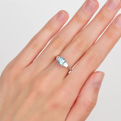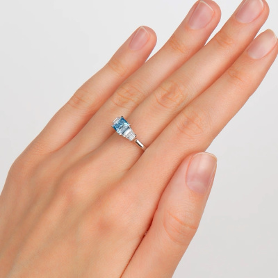 Кольцо с 1 бриллиантом выращенным, 1.01 карат, огранка принцесса 65 граней, цвет Голубой, чистота 5, тип огранки А; 2 бриллиантами выращенными, 0.52 карат, огранка багет 25 граней, цвет 3, чистота 5, тип огранки А; 14 бриллиантами выращенными, 0.11 карат, огранка круг 57 граней, цвет 3, чистота 6, тип огранки А; Белое золото 585 пробы.