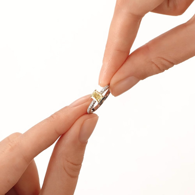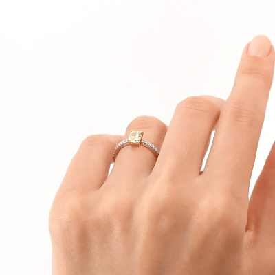 Кольцо с 1 бриллиантом выращенным, 0.69 карат, цвет Желтый, чистота 5, тип огранки А; 18 бриллиантами выращенными, 0.14 карат, огранка круг 57 граней, цвет 3, чистота 6, тип огранки А; Желтое и белое золото 585 пробы.