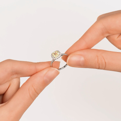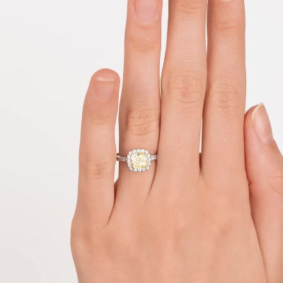 Кольцо с 1 бриллиантом выращенным, 1.29 карат, огранка кушон 57 граней, цвет Желтый, чистота 5, тип огранки А; 32 бриллиантами выращенными, 0.25 карат, огранка круг 57 граней, цвет 3, чистота 5, тип огранки А; Белое золото 585 пробы.