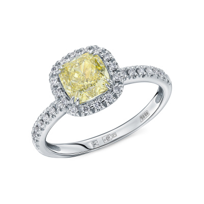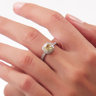 Кольцо с 1 бриллиантом выращенным, 1.23 карат, огранка кушон 57 граней, цвет Желтый, чистота 5, тип огранки А; 32 бриллиантами выращенными, 0.21 карат, огранка круг 57 граней, цвет 3, чистота 6, тип огранки А; Белое золото 585 пробы.