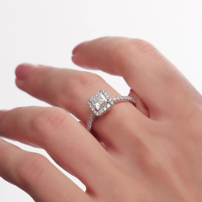 Кольцо с 1 бриллиантом выращенным, 0.77 карат, огранка принцесса 65 граней, цвет 4, чистота 5, тип огранки А; 34 бриллиантами выращенными, 0.34 карат, огранка круг 57 граней, цвет 3, чистота 5, тип огранки А; 14 бриллиантами выращенными, 0.09 карат, огранка круг 57 граней, цвет 3, чистота 5, тип огранки А; Белое золото 585 пробы.