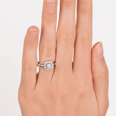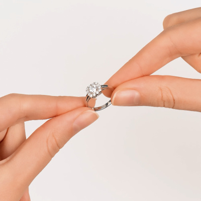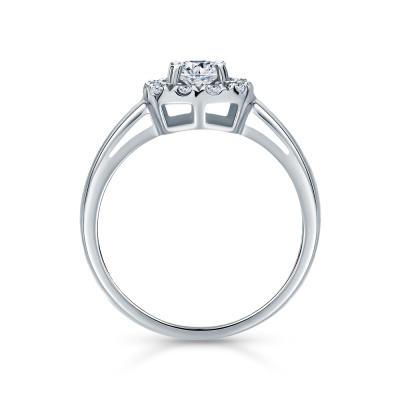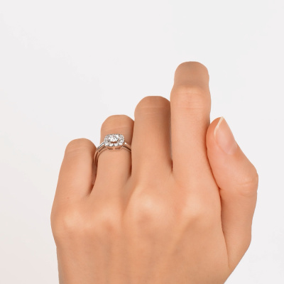 Кольцо с 1 бриллиантом выращенным, 0.32 карат, огранка круг 57 граней, цвет 4, чистота 5, тип огранки А; 12 бриллиантами выращенными, 0.09 карат, огранка круг 57 граней, цвет 3, чистота 4, тип огранки А; Белое золото 585 пробы.