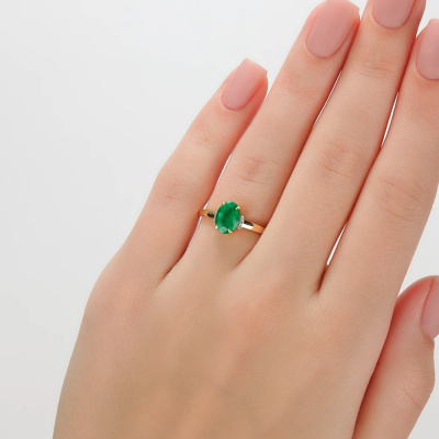Кольцо с 6 бриллиантами природными, 0.02 карат, огранка круг 17 граней, цвет 2, чистота 2, тип огранки А; 1 изумрудом природным, 1.12 карат, цвет 3, чистота 3, тип огранки Б; Желтое золото 585 пробы.