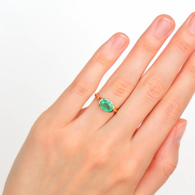 Кольцо с 10 бриллиантами природными, 0.04 карат, огранка круг 17 граней, цвет 2, чистота 2, тип огранки А; 1 изумрудом природным, 1.23 карат, цвет 4, чистота 3, тип огранки Б; Желтое золото 585 пробы.