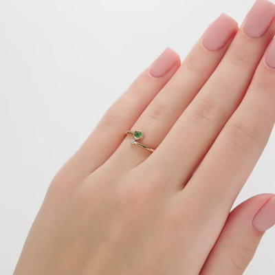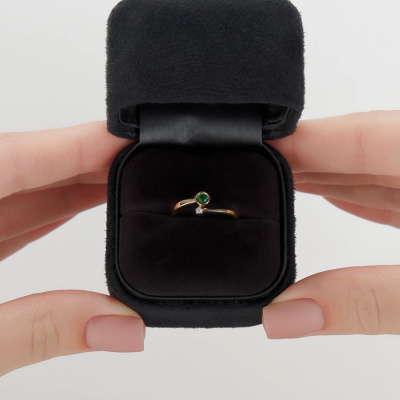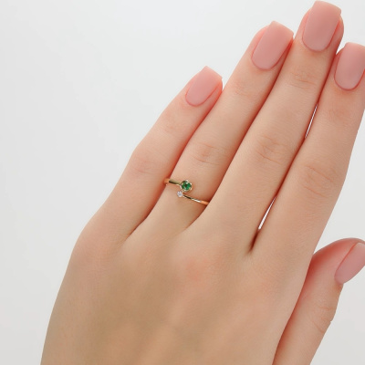 Кольцо с 1 бриллиантом природным, 0.009 карат, огранка круг 57 граней, цвет 3, чистота 6, тип огранки А; 1 изумрудом природным, 0.06 карат, цвет 3, чистота 3, тип огранки В; Желтое золото 585 пробы.