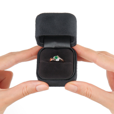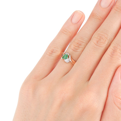 Кольцо с 14 бриллиантами природными, 0.06 карат, огранка круг 17 граней, цвет 2, чистота 2, тип огранки А; 1 изумрудом природным, 0.25 карат, цвет 3, чистота 3, тип огранки В; Розовое золото 585 пробы.