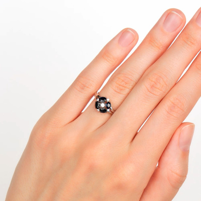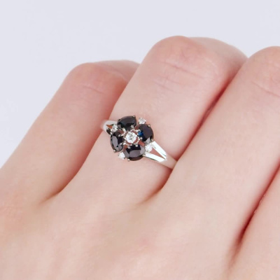 Кольцо с 1 бриллиантом природным, 0.03 карат, огранка круг 57 граней, цвет 3, чистота 6, тип огранки А; 4 бриллиантами природными, 0.03 карат, огранка круг 57 граней, цвет 3, чистота 6, тип огранки А; 4 сапфирами природными, 0.93 карат, цвет 2, чистота 2, тип огранки Б; Белое золото 585 пробы.