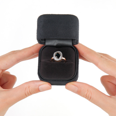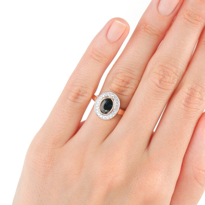 Кольцо с 22 бриллиантами природными, 0.16 карат, огранка круг 57 граней, цвет 3, чистота 6, тип огранки А; 1 сапфиром природным, 1.28 карат, цвет 2, чистота 2, тип огранки Б; Розовое золото 585 пробы.