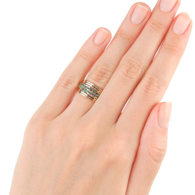 Кольцо с 1 изумрудом природным, 0.06 карат, цвет 3, чистота 3, тип огранки В; 1 сапфиром природным, 0.03 карат, цвет 2, чистота 2, тип огранки В; 2 сапфирами природными, 0.03 карат, цвет 2, чистота 2, тип огранки В; 3 изумрудами природными, 0.03 карат, цвет 3, чистота 3, тип огранки В; 5 сапфирами природными, 0.06 карат, цвет 2, чистота 2, тип огранки В; 6 изумрудами природными, 0.04 карат, цвет 3, чистота 3, тип огранки В; Желтое золото 585 пробы.