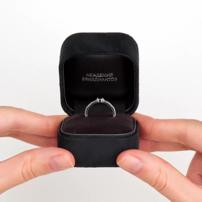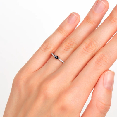 Кольцо с 10 бриллиантами природными, 0.06 карат, огранка круг 17 граней, цвет 2, чистота 2, тип огранки А; 1 сапфиром природным, 0.18 карат, цвет 2, чистота 2, тип огранки Б; Белое золото 585 пробы.