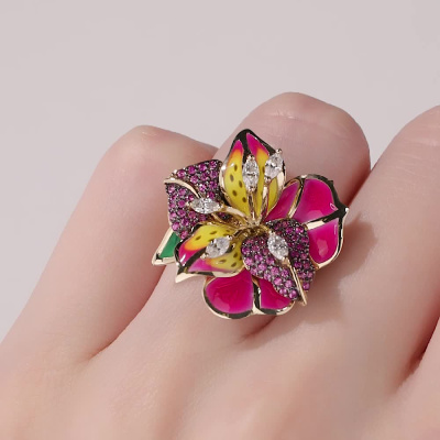 Кольцо с 5 бриллиантами природными, 0.36 карат, огранка маркиз 55 граней, цвет 2, чистота 4, тип огранки А; 64 сапфирами розовыми природными, 0.37 карат, цвет 2, чистота 2, тип огранки А; 1 эмаль витражная, тип огранки А; Желтое золото 585 пробы.