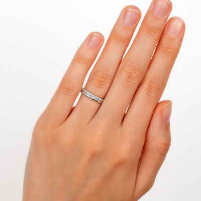 Кольцо с 3 бриллиантами природными, 0.03 карат, огранка круг 17 граней, цвет 2, чистота 2, тип огранки А; 19 бриллиантами природными, 0.08 карат, огранка круг 17 граней, цвет 2, чистота 2, тип огранки А; Белое золото 585 пробы.