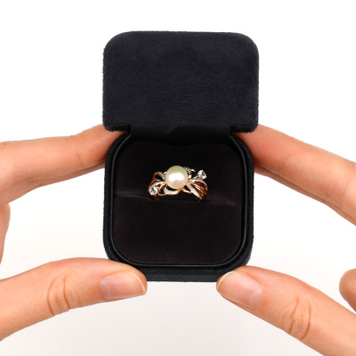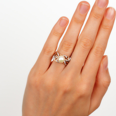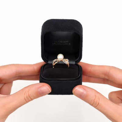 Кольцо с 6 бриллиантами природными, 0.03 карат, огранка круг 17 граней, цвет 2, чистота 2, тип огранки А; 1 жемчугом пресноводным культивированным белым, 3.269 карат; 2 сапфирами бесцветными природными, 0.283 карат; Розовое золото 585 пробы.