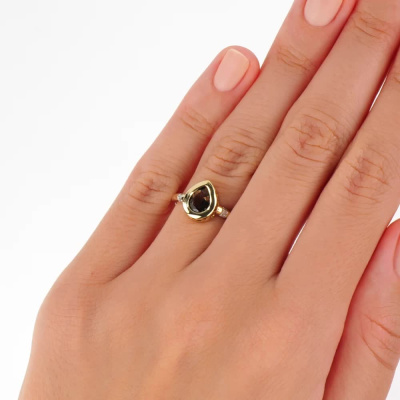 Кольцо с 6 бриллиантами природными, 0.03 карат, огранка круг 17 граней, цвет 2, чистота 2, тип огранки А; 1 кварцем дымчатым природным, 0.62 карат; Желтое золото 585 пробы.