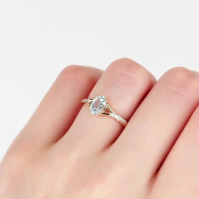 Кольцо с 10 бриллиантами природными, 0.05 карат, огранка круг 17 граней, цвет 2, чистота 2, тип огранки А; 1 топазом скай природным, 0.9 карат; Розовое золото 585 пробы.