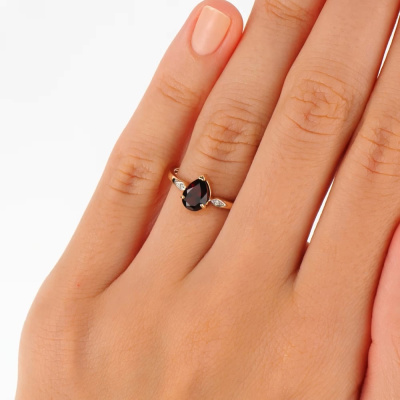 Кольцо с 2 бриллиантами природными, 0.01 карат, огранка круг 17 граней, цвет 2, чистота 2, тип огранки А; 1 гранатом природным, 0.849 карат; Розовое золото 585 пробы.