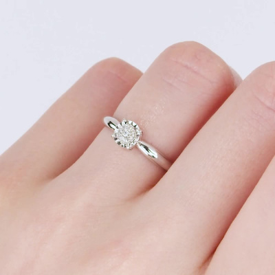Кольцо с 1 бриллиантом природным, 0.01 карат, огранка круг 57 граней, цвет 4, чистота 5, тип огранки А; 6 бриллиантами природными, 0.04 карат, огранка круг 17 граней, цвет 2, чистота 2, тип огранки А; Белое золото 585 пробы.