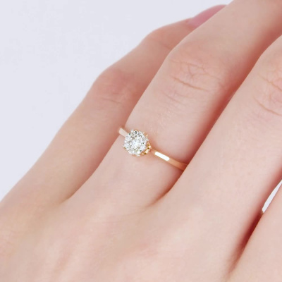 Кольцо с 1 бриллиантом природным, 0.08 карат, огранка круг 57 граней, цвет 4, чистота 5, тип огранки А; 8 бриллиантами природными, 0.07 карат, огранка круг 57 граней, цвет 4, чистота 5, тип огранки А; Розовое и белое золото 585 пробы.