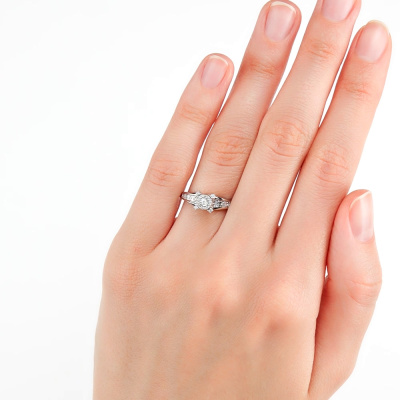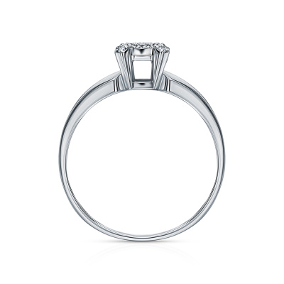 Кольцо с 1 бриллиантом природным, 0.01 карат, огранка круг 57 граней, цвет 4, чистота 5, тип огранки А; 14 бриллиантами природными, 0.05 карат, огранка круг 17 граней, цвет 2, чистота 2, тип огранки А; 12 бриллиантами природными, 0.02 карат, огранка круг 17 граней, цвет 2, чистота 2, тип огранки А; Белое золото 585 пробы.