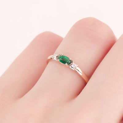Кольцо с 2 бриллиантами природными, 0.03 карат, огранка круг 57 граней, цвет 3, чистота 6, тип огранки А; 1 гидротермальным изумрудом, 0.19 карат; Розовое золото 585 пробы.