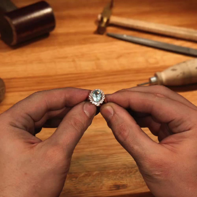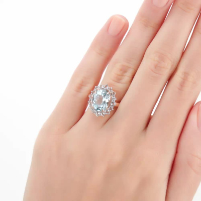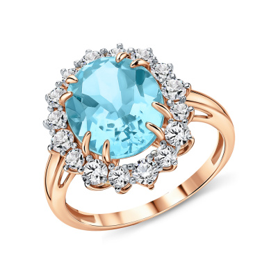 Кольцо с 1 топазом скай природным, 4.29 карат; 8 горными хрусталями природными, 0.44 карат; 8 горными хрусталями природными, 0.25 карат; Розовое золото 585 пробы.