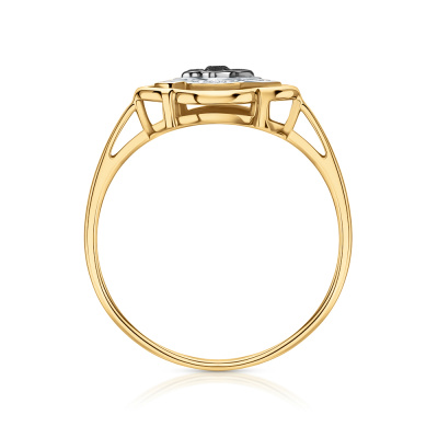 Кольцо с 4 бриллиантами природными, 0.01 карат, огранка круг 17 граней, цвет 2, чистота 2, тип огранки А; 1 бриллиантом черным природным облагороженным, 0.02 карат, огранка круг 57 граней, цвет 7, чистота 6, тип огранки А; 4 бриллиантами черными природными облагороженными, 0.03 карат, огранка круг 57 граней, цвет 7, чистота 6, тип огранки А; Желтое золото 585 пробы.