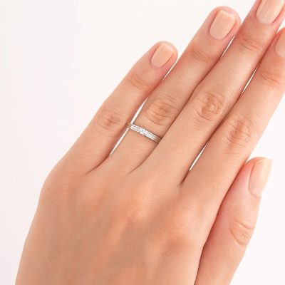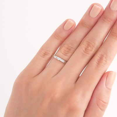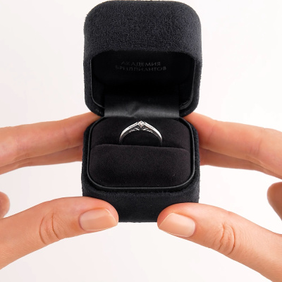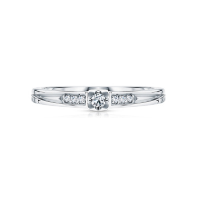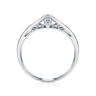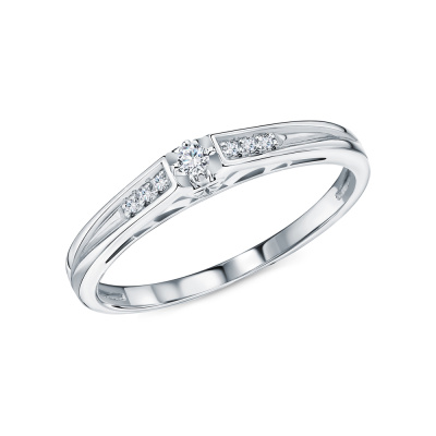 Кольцо с 1 бриллиантом природным, 0.02 карат, огранка круг 57 граней, цвет 4, чистота 6, тип огранки А; 6 бриллиантами природными, 0.02 карат, огранка круг 17 граней, цвет 2, чистота 2, тип огранки А; Белое золото 585 пробы.