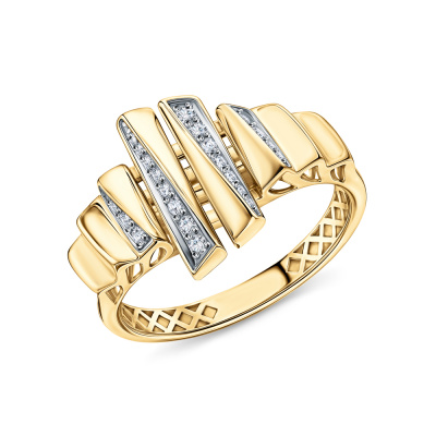 Кольцо с 10 бриллиантами природными, 0.08 карат, огранка круг 57 граней, цвет 3, чистота 6, тип огранки А; 13 бриллиантами природными, 0.04 карат, огранка круг 57 граней, цвет 3, чистота 6, тип огранки А; Желтое золото 585 пробы.