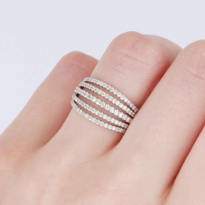 Кольцо с 20 бриллиантами природными, 0.14 карат, огранка круг 57 граней, цвет 3, чистота 6, тип огранки А; 84 бриллиантами природными, 0.34 карат, огранка круг 57 граней, цвет 3, чистота 6, тип огранки А; Белое золото 585 пробы.