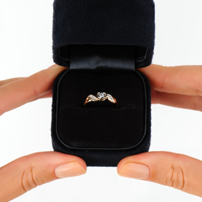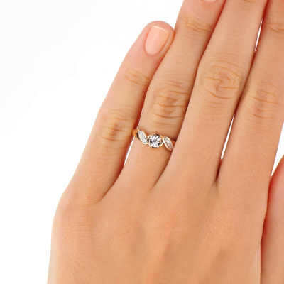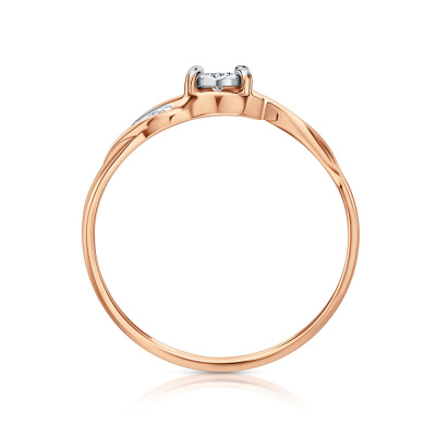 Кольцо с 1 бриллиантом природным, 0.03 карат, огранка круг 57 граней, цвет 3, чистота 6; 4 бриллиантами природными, 0.01 карат, огранка круг 17 граней, цвет 2, чистота 2; Розовое и белое золото 375 пробы.