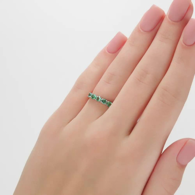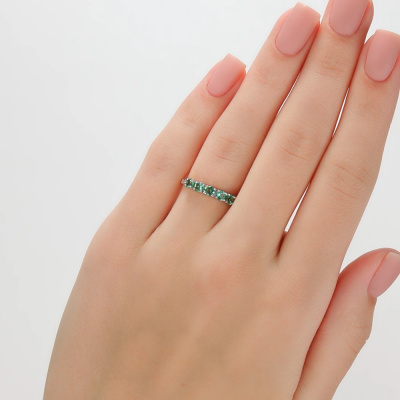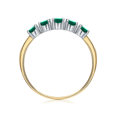 Кольцо с 6 бриллиантами природными, 0.02 карат, огранка круг 17 граней, цвет 2, чистота 2, тип огранки А; 5 изумрудами природными, 0.48 карат, цвет 3, чистота 3; Желтое золото 585 пробы.