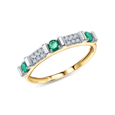 Кольцо с 12 бриллиантами природными, 0.05 карат, огранка круг 17 граней, цвет 2, чистота 2, тип огранки А; 3 изумрудами природными, 0.15 карат, цвет 3, чистота 3, тип огранки В; Желтое золото 585 пробы.