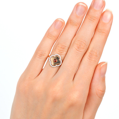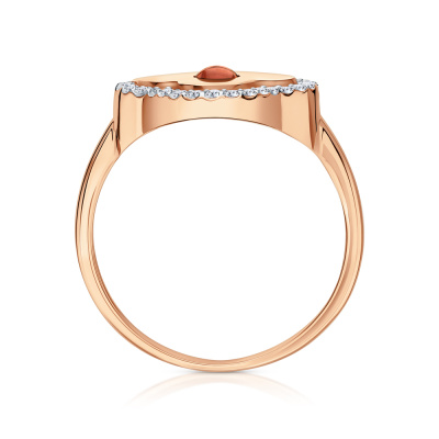 Кольцо с 32 бриллиантами природными, 0.13 карат, огранка круг 17 граней, цвет 2, чистота 2, тип огранки А; 1 гранатом природным, 0.2 карат; Розовое золото 585 пробы.
