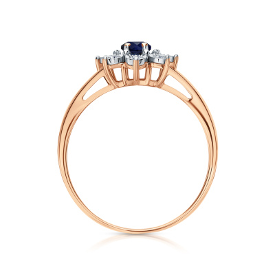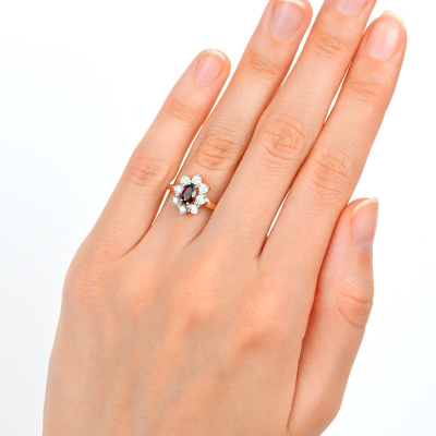 Кольцо с 8 бриллиантами природными, 0.11 карат, огранка круг 57 граней, цвет 4, чистота 5, тип огранки А; 1 гранатом природным, 0.55 карат; Розовое и белое золото 585 пробы.