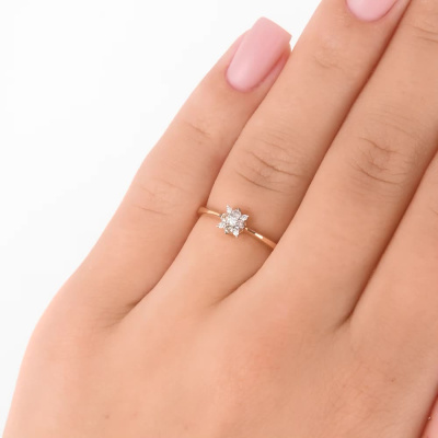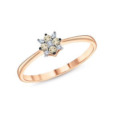 Кольцо с 1 бриллиантом природным, 0.008 карат, огранка круг 57 граней, цвет 4, чистота 4, тип огранки А; 4 бриллиантами природными, 0.01 карат, огранка круг 17 граней, цвет 2, чистота 2, тип огранки А; 4 бриллиантами коньячными природными, 0.09 карат, огранка круг 57 граней, цвет 7, чистота 5, тип огранки А; Розовое золото 585 пробы.