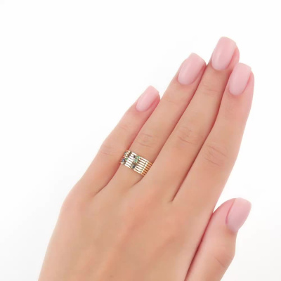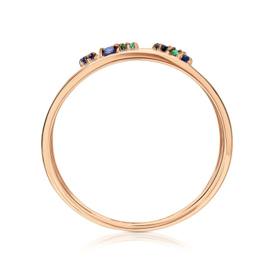 Кольцо с 1 сапфиром природным, 0.03 карат, цвет 2, чистота 2, тип огранки В; 3 сапфирами природными, 0.03 карат, цвет 2, чистота 2, тип огранки В; 2 изумрудами природными, 0.02 карат, цвет 3, чистота 3, тип огранки В; 1 изумрудом природным, 0.007 карат, цвет 3, чистота 3, тип огранки В; Желтое золото 585 пробы.