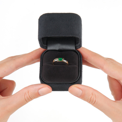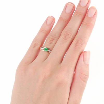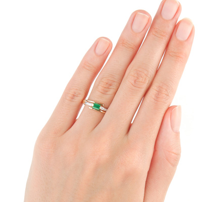 Кольцо с 6 бриллиантами природными, 0.03 карат, огранка круг 57 граней, цвет 3, чистота 6, тип огранки А; 1 изумрудом природным, 0.25 карат, цвет 3, чистота 3, тип огранки Б; Желтое золото 585 пробы.